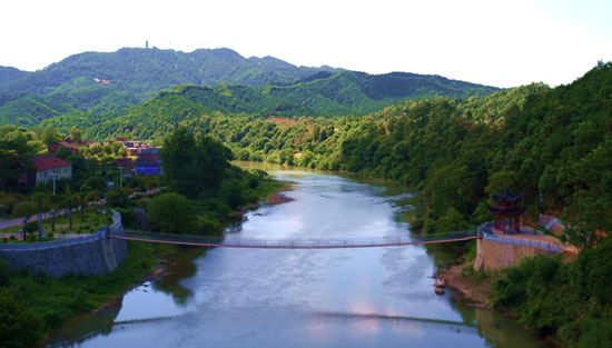 铁索桥1992年修建,2014年重建。桥长108m,宽2m,以8根铁索做梁,铺以木板,悬于永乐江上,连通东西。此桥不仅是勾连两岸的最佳通道,还是观瞻大石风光、沿河美景的绝佳处所,与文塔、月潭、宝塔岭、桃花岛共同构成一幅高低错落有致的画面。